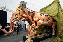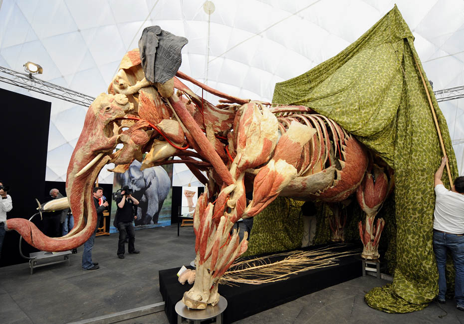 德國著名解剖學家鞏特爾·馮·哈根斯博士被稱為“死亡先生”,目前展出的是有史以來的最大的動物尸體。體型巨大的“桑芭”尸體高3.5米,重3.2噸。據(jù)悉“桑芭”將于2010年4月歸還諾因基興動物園。圖片來源:中國新聞網(wǎng)