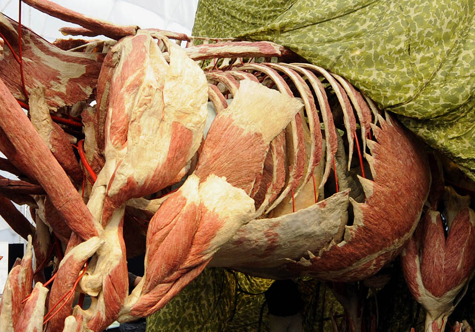 德國著名解剖學家鞏特爾·馮·哈根斯博士被稱為“死亡先生”,目前展出的是有史以來的最大的動物尸體。體型巨大的“桑芭”尸體高3.5米,重3.2噸。據(jù)悉“桑芭”將于2010年4月歸還諾因基興動物園。圖片來源:中國新聞網(wǎng)