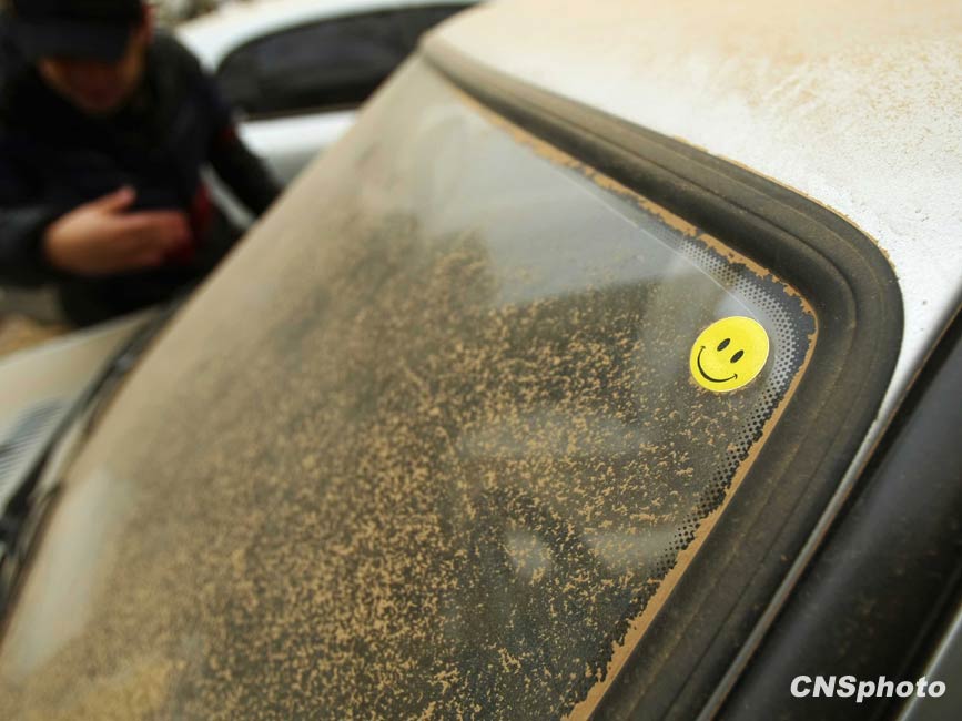 3月20日,春季首場(chǎng)重度浮塵天遮蓋了整個(gè)北京城。圖為一輛轎車的后車窗上布滿黃沙。中新社發(fā) 富田 攝