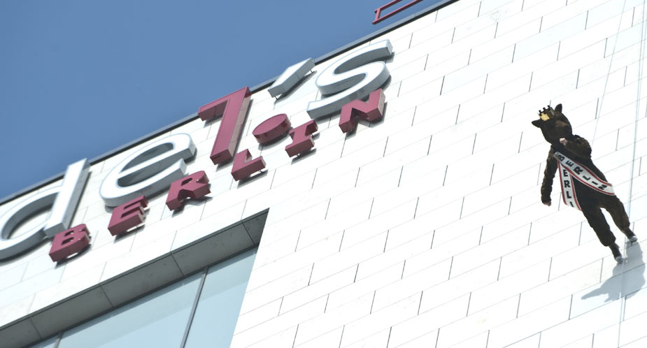 3月18日,在德國柏林舉行的“高樓漫步”活動中,一名女子打扮成熊的模樣(柏林的象征)在天使酒店外墻上行走,參加活動的人都有繩索保護。