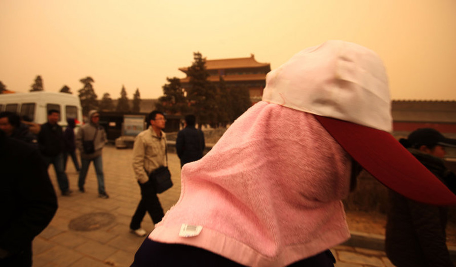 20日,北京遭遇4年來最強浮塵襲擊。游客面帶口罩在沙塵暴中游覽故宮。cuihao 攝