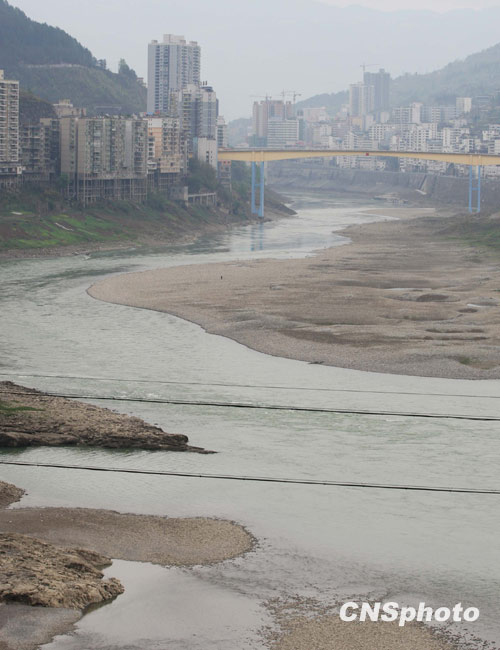3月23日,重慶市武隆縣境內(nèi)的烏江段河床大面積裸露,河面嚴重變窄。近段時間以來,受貴州、重慶地區(qū)持續(xù)干旱、來水減少的影響,烏江航道重慶段徑流量較常年減少40%以上,水位平均下降1米左右,船舶在航行過程中多次出現(xiàn)觸礁、擱淺等事故。當(dāng)?shù)胤姥纯购缔k公室透露,目前烏江重慶段已基本斷航,每天均有不少船只?看a頭等待上游的彭水電站調(diào)峰發(fā)電增大烏江水量,以便通過變得狹窄的烏江向下游航行。 中新社發(fā) 郭晉嘉 攝