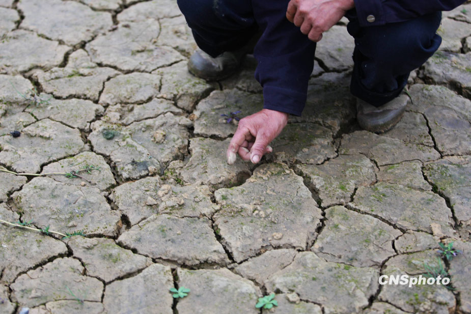 3月23日,重慶武隆縣玉荷村一座水塘已完全干涸,原本池底的淤泥干裂成塊。重慶武隆縣自去年入冬以來,相繼遭受冬干春旱,塘庫蓄水量劇減,人飲蓄水池干枯,溪溝斷流。目前,該縣部分水庫出現(xiàn)枯竭狀況,14.95萬人飲水困難,占總?cè)丝诘?7%。預(yù)計到4月中旬,武隆飲水困難人口將達(dá)到18萬人。中新社發(fā) 郭晉嘉 攝