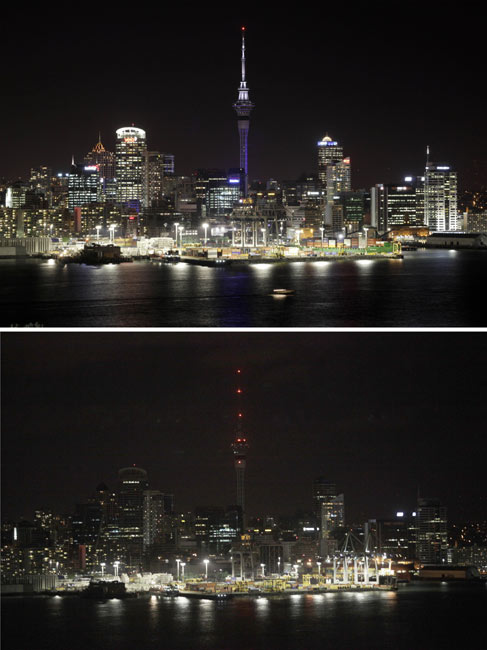 由世界自然基金會發(fā)起的“地球一小時”環(huán);顒27日20點(diǎn)30分按照時區(qū)依次在全球數(shù)千個城市展開。圖為新西蘭天空塔在熄燈前和熄燈后的景色。