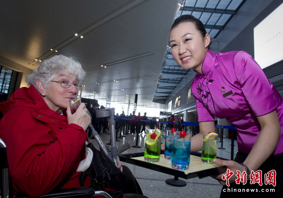 3月25日,上海虹橋機(jī)場(chǎng)T2航站樓。上航世博金牌示范乘務(wù)員徐翼邀請(qǐng)一名坐在輪椅上的外國(guó)旅客品嘗“世博特飲”。劉行喆/CFP