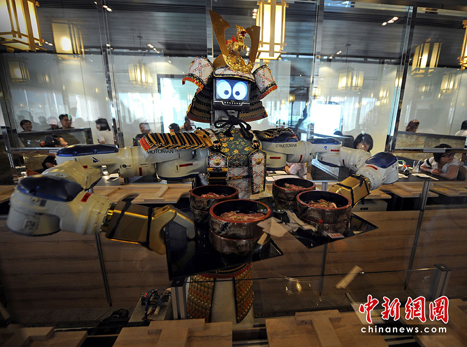這家日本餐館是泰國首家擁有機(jī)器人服務(wù)員的餐館,顧客可以通過電子觸摸屏進(jìn)行點菜,機(jī)器人則會帶來相應(yīng)的服務(wù)。機(jī)器人服務(wù)員能有節(jié)奏地跳舞,還可以自動到餐桌為客人收走空盤子。