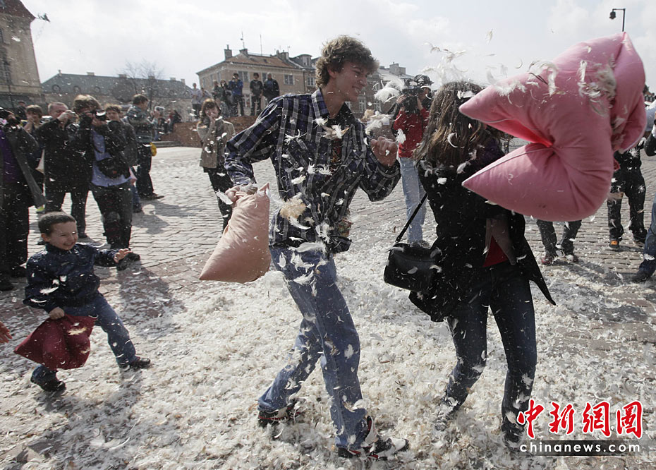 4月3日是國(guó)際“枕頭大戰(zhàn)”日。在這一天,多個(gè)國(guó)家的“枕頭大戰(zhàn)”愛好者相約走上街頭,用獨(dú)特的方式來慶祝他們的節(jié)日。圖片來源:中國(guó)新聞網(wǎng)