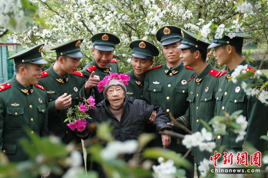 4月4日, 武警浙江省溫嶺市中隊10多位剛下中隊的新兵們,首次專門帶孤寡老人林文錦到城郊踏春游。當(dāng)日,新兵們商定派代表扶奶奶去“春游”。93歲的林文錦奶奶開心地說:“今天,是第33次短途‘春游’。中新社發(fā) 江勇兵 攝
