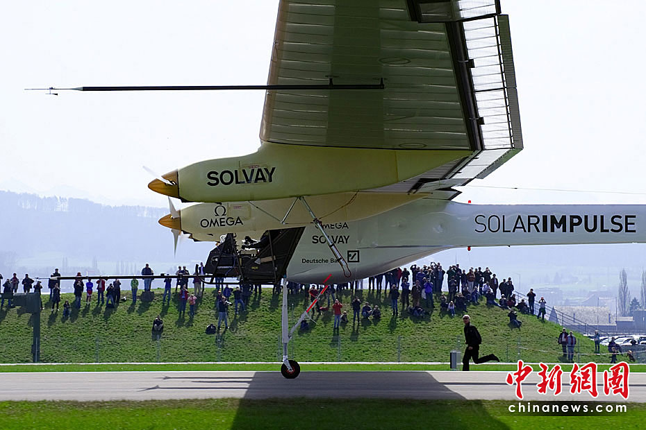 當(dāng)?shù)貢r(shí)間4月7日上午,全球首架依靠太陽能驅(qū)動(dòng)的飛機(jī)進(jìn)行首次試飛,預(yù)計(jì)此種新型飛機(jī)將在2011年實(shí)現(xiàn)環(huán)球航行。圖片來源:中國新聞網(wǎng)