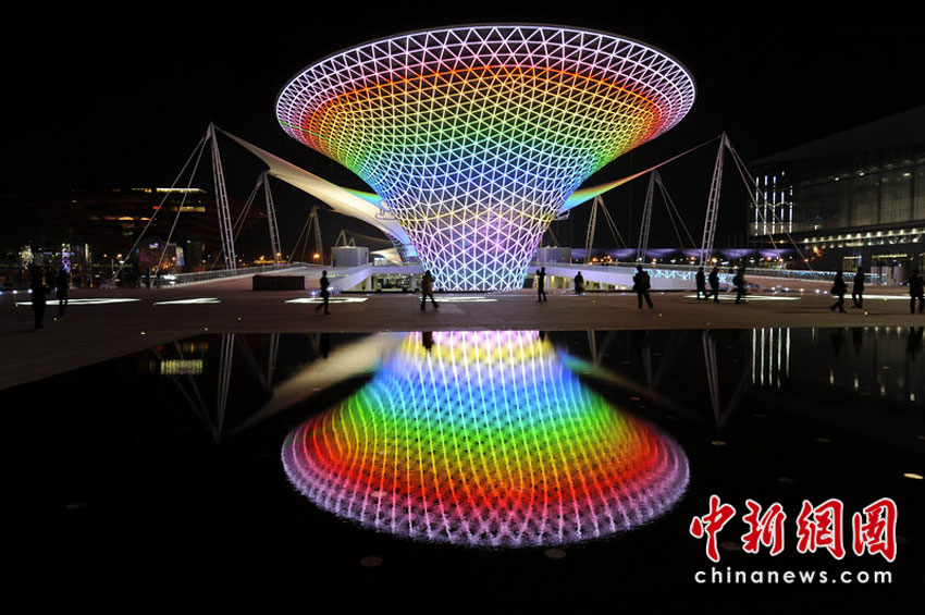 4月8日,上海世博會(huì)園區(qū)各大洲國(guó)家展館的建設(shè)和布展絕大多數(shù)已經(jīng)進(jìn)入尾聲。圖為世博軸太陽(yáng)谷在水中的夜景。梁臻 攝