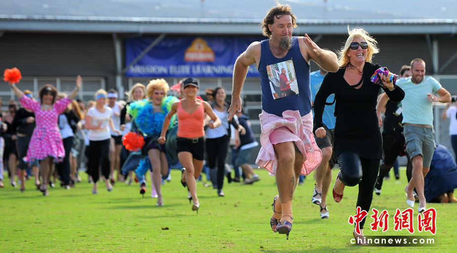4月10日,在澳大利亞墨爾本,人們穿著高跟鞋賽跑。旨在挑戰(zhàn)多人穿高跟鞋賽跑的吉尼斯世界紀(jì)錄。盡管最終挑戰(zhàn)失敗,參賽者仍在80米的賽道上爭先恐后,各顯神通。