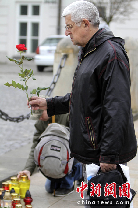 圖為波蘭華沙總統(tǒng)府前,有民眾拿著鮮花悼念身亡的總統(tǒng)。波蘭總統(tǒng)卡欽斯基乘坐的飛機(jī)10日在俄斯摩棱斯克失事,波蘭總統(tǒng)卡欽斯基已經(jīng)確認(rèn)死亡。有報道稱,飛機(jī)可能是在降落時被樹剮到,沒能在跑道上落地而墜落。不過亦有俄羅斯安全部門消息人士稱,人為失誤可能是造成波蘭總統(tǒng)專機(jī)墜毀的最主要原因。
