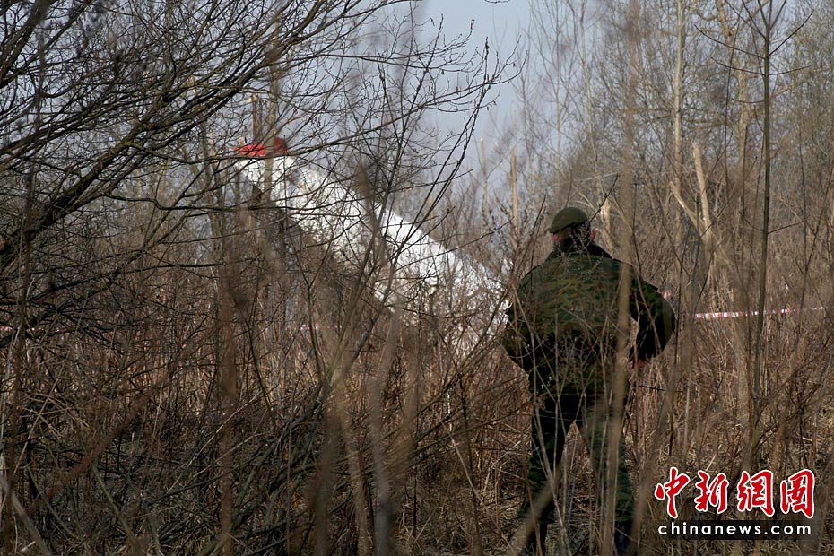 4月11日,波蘭總統(tǒng)卡欽斯基專機(jī)在俄羅斯斯摩棱斯克軍用機(jī)場墜毀地點附近的道路開通,但是警戒線核心區(qū)仍然關(guān)閉。俄波調(diào)查人員正在現(xiàn)場工作。圖片來源:中國新聞網(wǎng)
