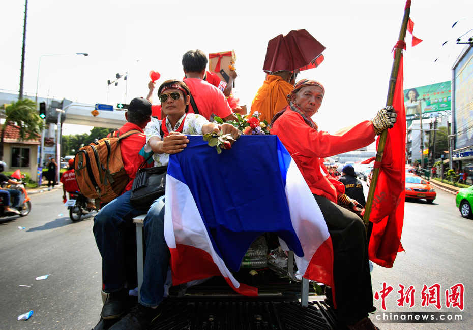 當(dāng)?shù)貢r間4月12日,泰國紅衫軍在曼谷市區(qū)抬著棺材舉行游行,借此向政府施壓促阿披實(shí)下臺。此前紅衫軍示威者與軍警發(fā)生沖突,造成21人死亡。圖片來源:中國新聞網(wǎng)