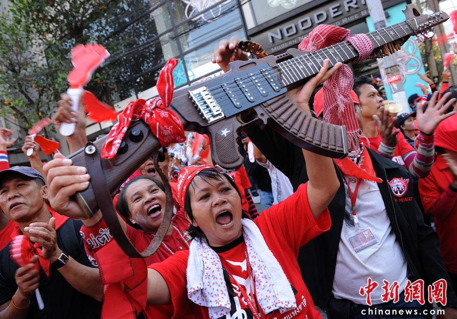當?shù)貢r間4月12日,泰國紅衫軍在曼谷市區(qū)抬著棺材舉行游行,借此向政府施壓促阿披實下臺。此前紅衫軍示威者與軍警發(fā)生沖突,造成21人死亡。圖片來源:中國新聞網(wǎng)