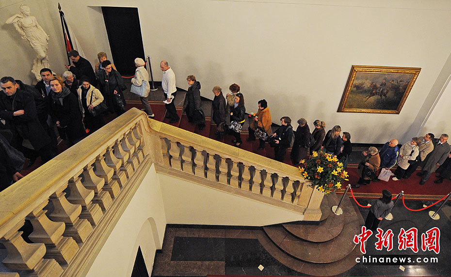 當?shù)貢r間4月13日14時,波蘭總統(tǒng)夫婦的遺體被安放在總統(tǒng)府最大的圓柱廳供民眾瞻仰和悼念?偨y(tǒng)卡欽斯基及其夫人的葬禮將于18日舉行。圖片來源:中國新聞網