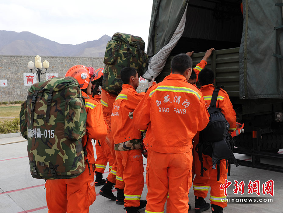 圖為4月14日下午17時(shí)50分,西藏消防總隊(duì)并西藏自治區(qū)地震災(zāi)害緊急救援總隊(duì)派出直屬特勤大隊(duì)30名官兵、3輛救援跨區(qū)域遠(yuǎn)距離增援玉樹地震災(zāi)區(qū)。中新社發(fā) 陶盛楷 攝