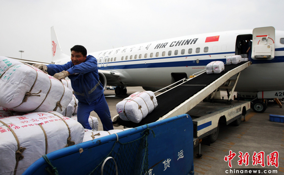 4月15日,重慶江北國(guó)際機(jī)場(chǎng)停機(jī)坪上,工人們緊張地將救援物資裝運(yùn)上飛機(jī)準(zhǔn)備起運(yùn)青海地震災(zāi)區(qū)。青海玉樹縣地震發(fā)生后,中共中央政治局委員、重慶市委書記薄熙來(lái)庚即作出重要批示,要求重慶全力以赴支援災(zāi)區(qū),根據(jù)災(zāi)區(qū)需求提供支援。中共重慶市委、市政府第一時(shí)間向青海省政府發(fā)去了慰問(wèn)電,并支援災(zāi)區(qū)300萬(wàn)元和大批救援物資,首批救援物資于當(dāng)日下去從重慶起飛空運(yùn)至災(zāi)區(qū)。中新社發(fā) 郭晉嘉 攝
