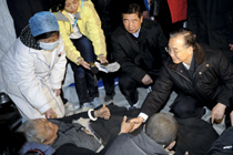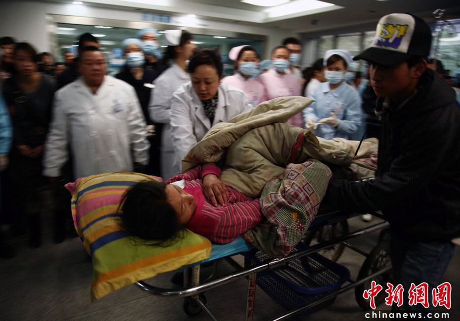 4月15日下午5時(shí)40分,首批青海玉樹(shù)地震傷員被送往四川省人民醫(yī)院進(jìn)行治療,這批傷員于15日下午5時(shí)許隨著中國(guó)空軍運(yùn)輸機(jī)抵達(dá)成都,每位傷員均有親人、家屬陪同。圖為即將被送進(jìn)急救中心的地震傷員。中新社發(fā) 張浪 攝