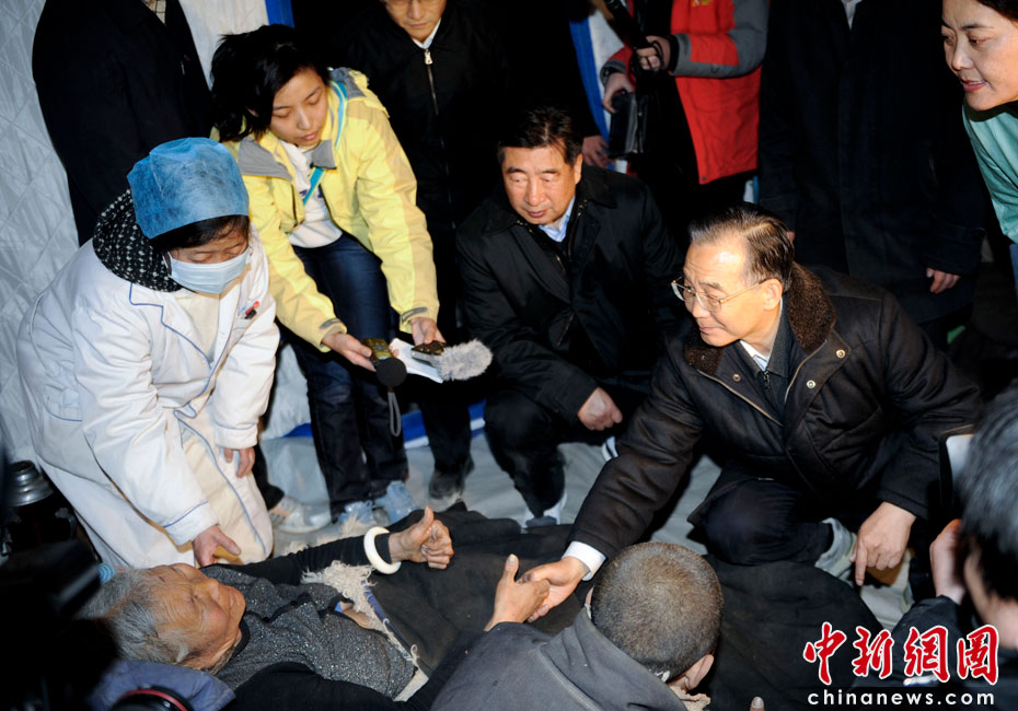 4月15日20時(shí),中國國務(wù)院總理溫家寶來到青海省玉樹縣玉樹自治州醫(yī)院看望受災(zāi)民眾。這是溫家寶握著一位藏族大媽的手問候其身體情況。國務(wù)院副總理回良玉、國務(wù)委員孟建柱參加看望慰問。中新社發(fā) 廖攀 攝