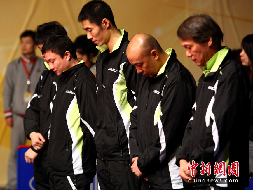 4月15日,亞歐乒乓球全明星對抗賽在北京進(jìn)行第二天的爭奪。賽前,現(xiàn)場所有球員和觀眾為青海玉樹地震災(zāi)區(qū)的遇難同胞默哀一分鐘,組委會(huì)宣布將把本次賽事的全部票房收入捐贈(zèng)地震災(zāi)區(qū)。中新社發(fā) 富田 攝