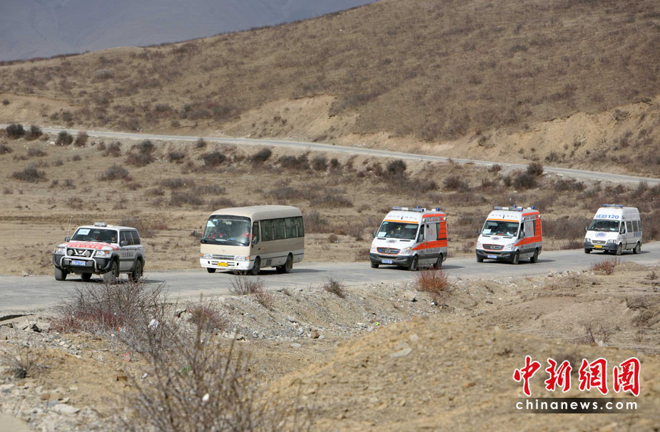 4月16日,四川省衛(wèi)生廳從成都派出首支國家醫(yī)療救援隊經(jīng)過1200余公里,40小時的長途跋涉,醫(yī)療救援車隊平安抵達(dá)青海省玉樹地震重災(zāi)區(qū)。圖為醫(yī)療車隊正在翻越海拔5000多米的海子山。中新社發(fā) 劉忠俊 攝