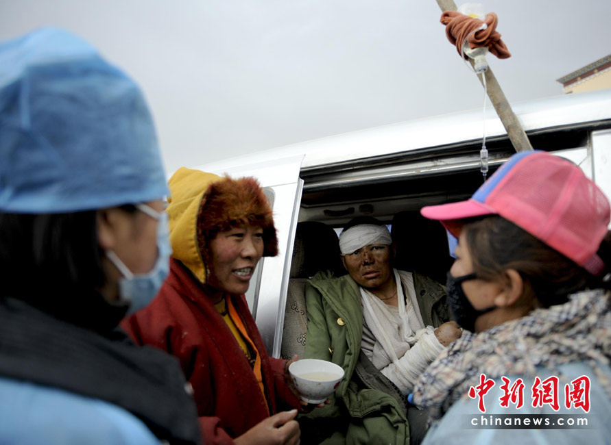 4月16日,一名地震中受傷者在青海玉樹(shù)體育場(chǎng)的車?yán)锝邮苤委煛?中新社發(fā) 廖攀 攝