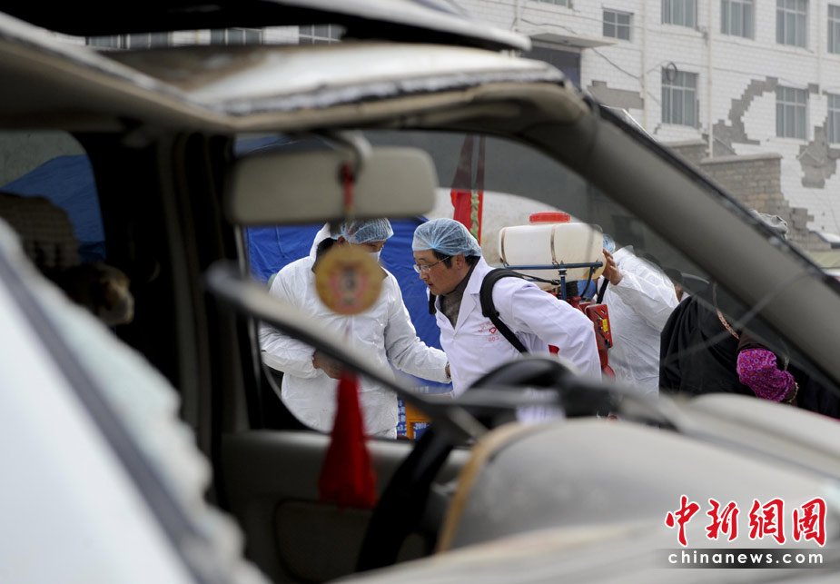 4月16日,青海玉樹(shù)體育場(chǎng)地震災(zāi)民安置點(diǎn),青海疾控中心人員開(kāi)展消毒防疫工作。 中新社發(fā) 廖攀 攝