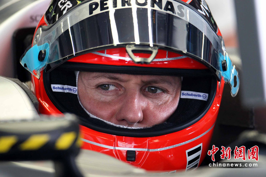 4月16日,2010國(guó)際汽聯(lián)F1世界錦標(biāo)賽上海站在上海國(guó)際賽車場(chǎng)開始車手第一、第二次練習(xí)賽。圖為代表梅賽德斯GP車隊(duì)出戰(zhàn)的老車王、德國(guó)車手舒馬赫重回上海賽道。 中新社記者 任晨鳴 攝