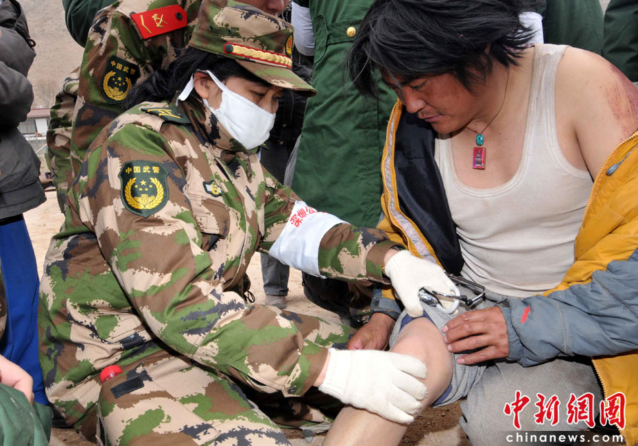 4月16日上午,廣東邊防總隊(duì)抗震救災(zāi)醫(yī)療隊(duì)在青海玉樹(shù)州結(jié)古鎮(zhèn)民族師范學(xué)院廣場(chǎng)設(shè)立救治點(diǎn),當(dāng)日救助地震災(zāi)區(qū)傷員200多名。中新社發(fā) 陳森陽(yáng) 攝