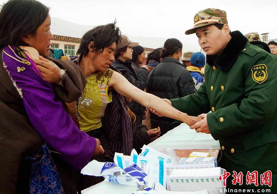 4月16日上午,廣東邊防總隊抗震救災醫(yī)療隊在青海玉樹州結(jié)古鎮(zhèn)民族師范學院廣場設立救治點,當日救助地震災區(qū)傷員200多名。中新社發(fā) 陳森陽 攝