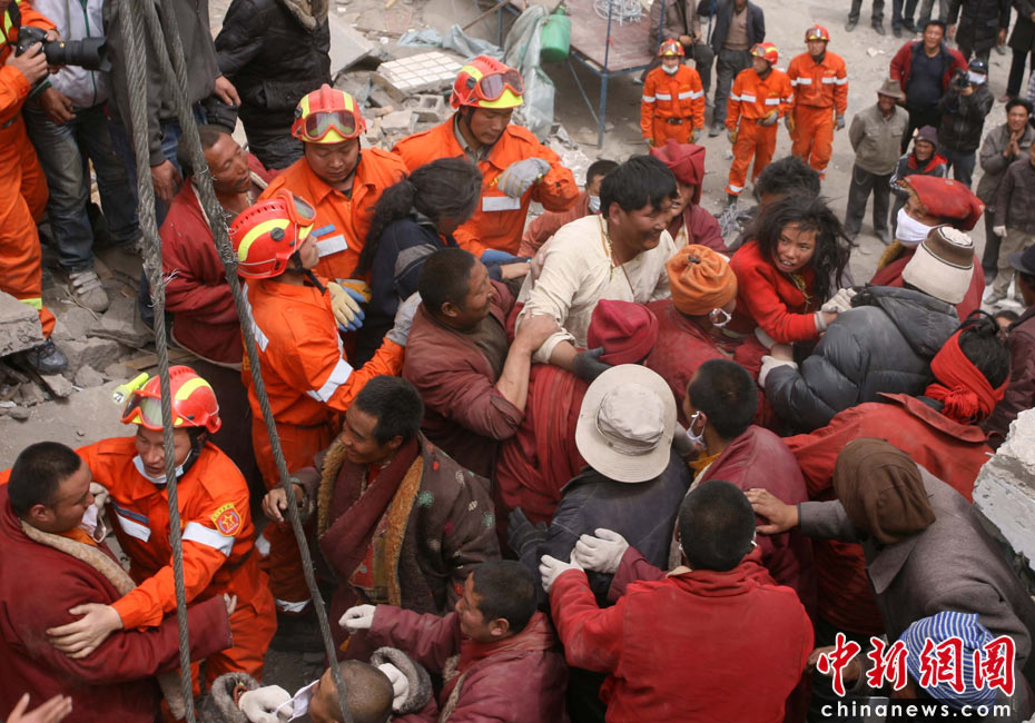 2010年4月16日13:50分左右,青海省玉樹(shù)藏族自治州玉樹(shù)縣地震發(fā)生第三天,在中心城區(qū)一垮塌賓館現(xiàn)場(chǎng)一名被埋54小時(shí)13歲的才珍拉姆被國(guó)家地震局應(yīng)急救援隊(duì)等成功救出。4月14日07時(shí)49分許,青海省玉樹(shù)藏族自治州玉樹(shù)縣(北緯33.1,東經(jīng)96.7)發(fā)生7.1級(jí)地震。中新社發(fā) 劉忠俊 攝