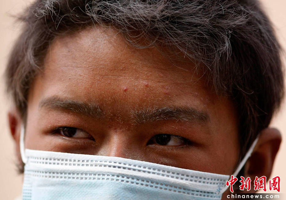 2010年4月16日,青海玉樹藏族自治州玉樹縣結(jié)古鎮(zhèn)一所中學的震災救援現(xiàn)場,救援人員的頭發(fā)、眉毛都落滿塵土。中新社發(fā) 盛佳鵬 攝