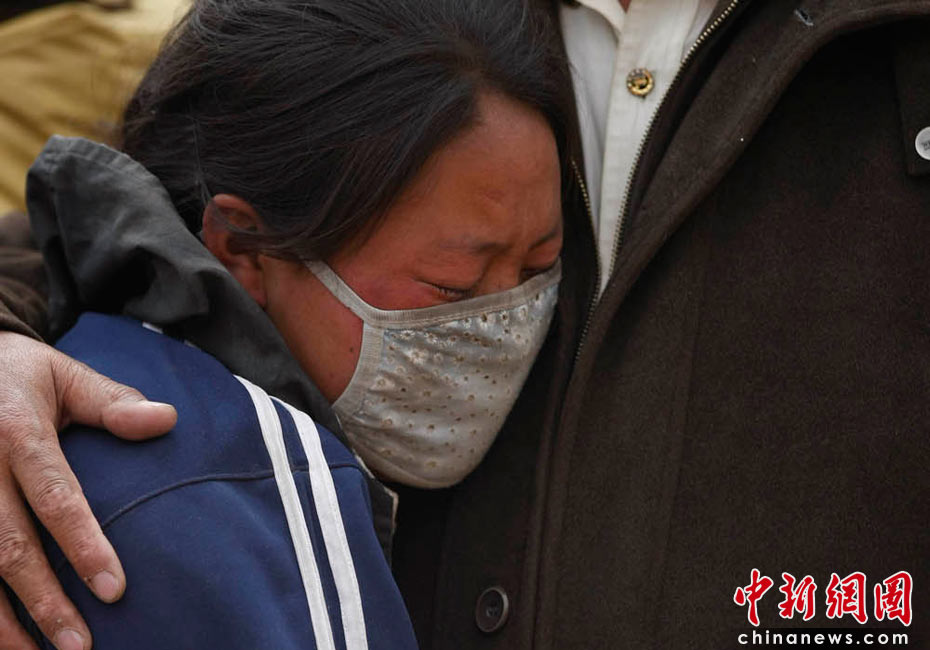 2010年4月16日,青海玉樹藏族自治州玉樹縣結(jié)古鎮(zhèn)一所中學的震災(zāi)救援現(xiàn)場,痛失孩子的母親淚流不止。中新社發(fā) 盛佳鵬 攝