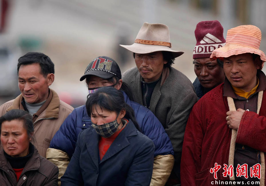 4月16日,青海玉樹結(jié)古鎮(zhèn)地震救援現(xiàn)場(chǎng),當(dāng)?shù)孛癖婈P(guān)注救援進(jìn)展情況。中新社發(fā) 盛佳鵬 攝