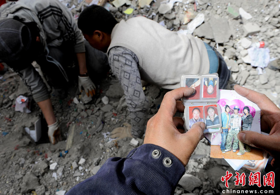 4月16日,青海玉樹民族師范學(xué)校內(nèi),玉樹州教育局官員扎西手持學(xué)生照片焦急等待現(xiàn)場(chǎng)救援進(jìn)展。中新社發(fā) 廖攀 攝