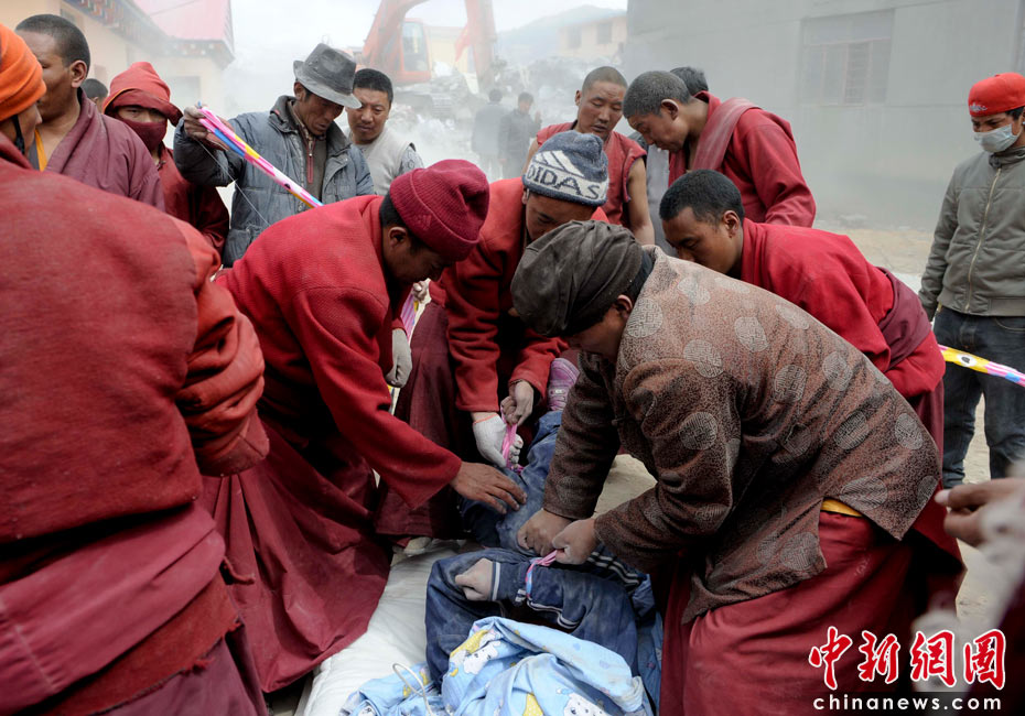 4月16日,青海玉樹民族師范學(xué)校坍塌的女生宿舍樓內(nèi),僧侶們正在協(xié)助救援人員挖掘遇難者遺體。中新社發(fā) 廖攀 攝