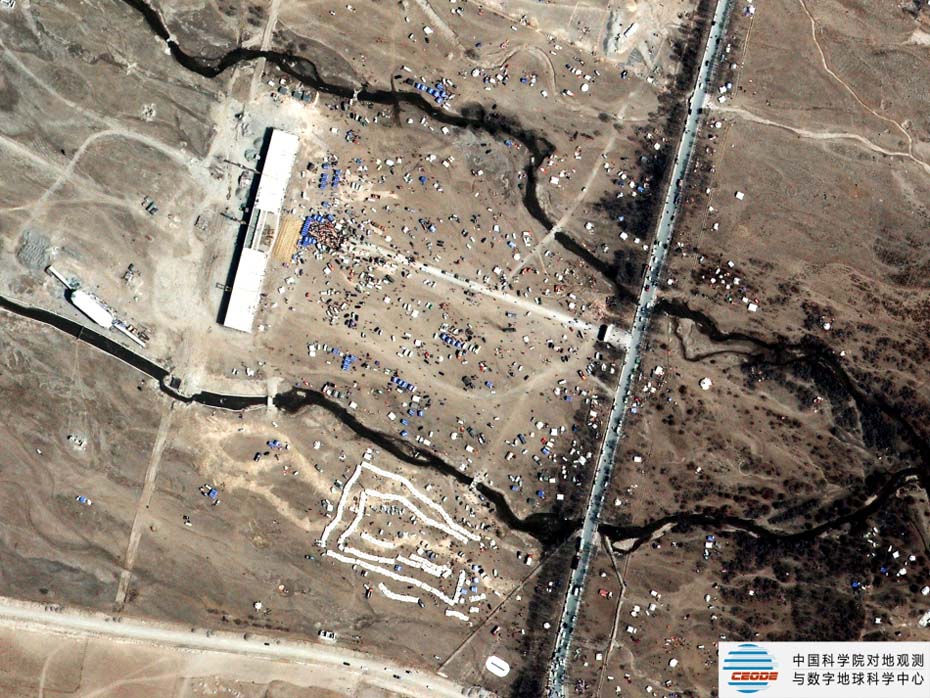 災(zāi)后避難所-馬場(chǎng)帳篷〔由中國(guó)科學(xué)院對(duì)地觀測(cè)與數(shù)字地球科學(xué)中心拍攝〕