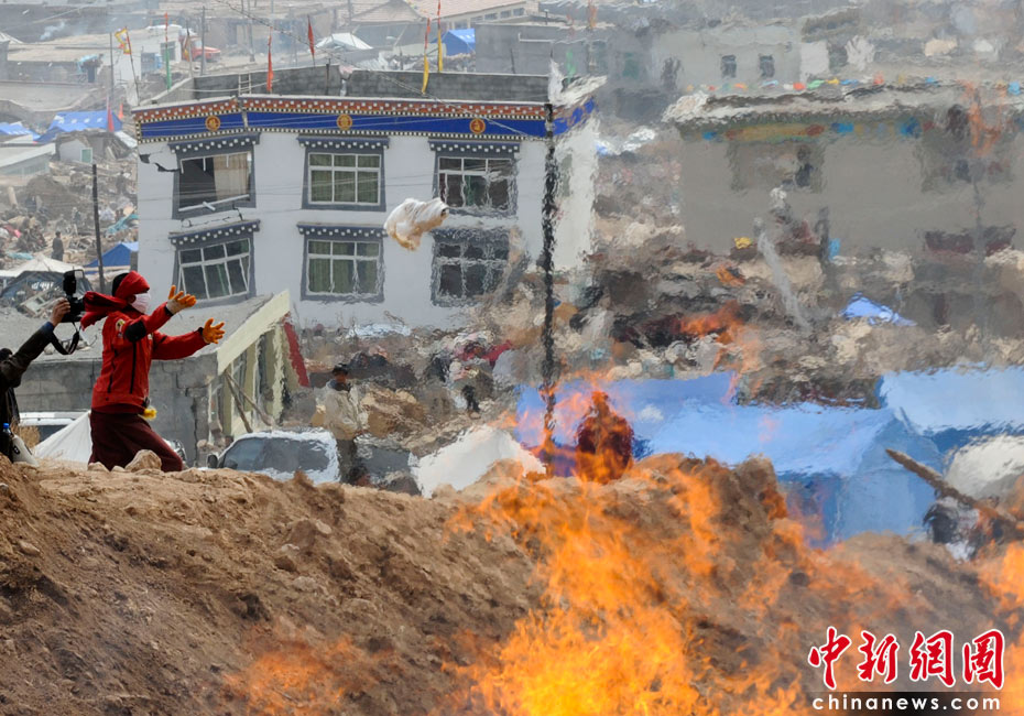 4月17日,青海省玉樹縣結(jié)古鎮(zhèn)附近的山坡上,眾多地震遇難者遺體被火葬。當日,為妥善及時處理遇難人員遺體,預防災區(qū)疫情的發(fā)生與流行,青海出臺地震遇難人員遺體處理意見,強調(diào)在處理遺體時要尊重少數(shù)民族喪葬習俗,尊重死者尊嚴。圖為眾多僧侶為逝者祈禱。中新社發(fā) 廖攀 攝