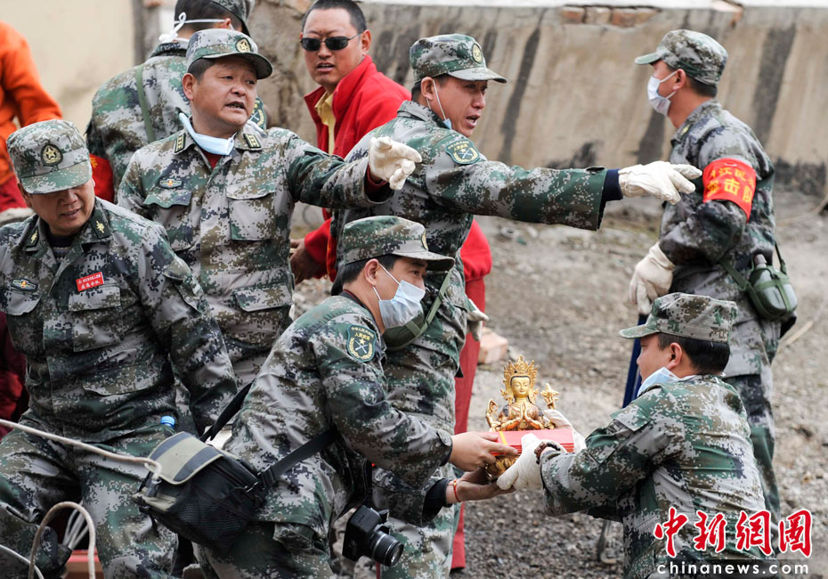 4月17日,青海玉樹結(jié)古鎮(zhèn)民主路,解放軍戰(zhàn)士為信眾清理廢墟中的法器。中新社發(fā) 廖攀 攝