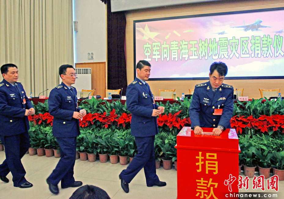4月17日,中國空軍啟動(dòng)“空軍向青海玉樹地震災(zāi)區(qū)捐款儀式”,號召全空軍廣大官兵向?yàn)?zāi)區(qū)人民捐款。在當(dāng)天的捐款儀式上即捐款13萬多元。這些捐款將在空軍向玉樹捐款活動(dòng)結(jié)束后,統(tǒng)一送往災(zāi)區(qū)。中新社發(fā) 譚超 攝