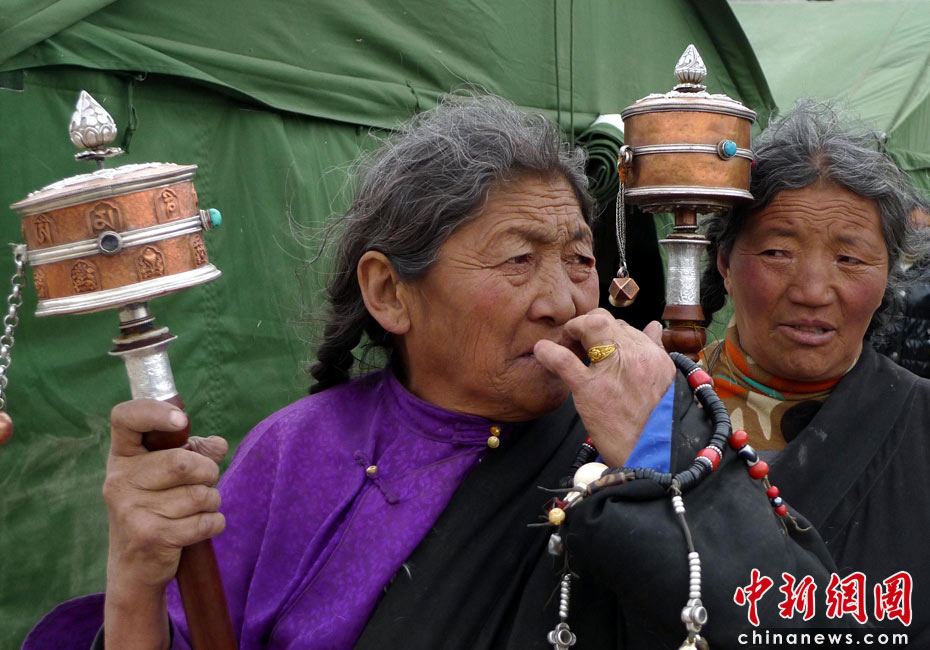 4月17日傍晚,玉樹震區(qū)街頭,兩位藏民轉(zhuǎn)經(jīng)祈福。中新社發(fā) 孫自法 攝