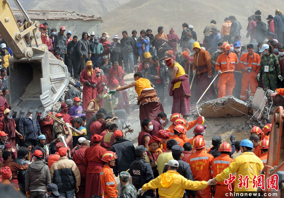 4月17日,中國地震救援隊、四川救援隊在玉樹結(jié)古鎮(zhèn)三岔路城建一號商鋪展開搜救,救援隊員、僧人、志愿者等在同一搜救點連續(xù)奮戰(zhàn)。中新社發(fā) 陳文 攝