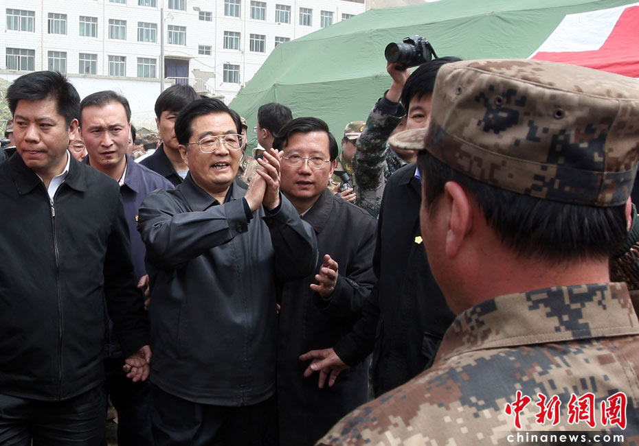 4月18日,中共中央總書(shū)記、國(guó)家主席、中央軍委主席胡錦濤飛抵玉樹(shù),看望慰問(wèn)地震災(zāi)區(qū)干部群眾,實(shí)地指導(dǎo)抗震救災(zāi)工作。中新社發(fā) 盛佳鵬 攝