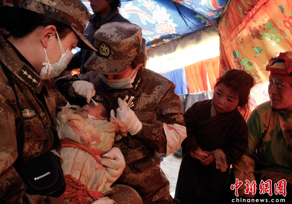 4月18日,總后青藏兵站部抗震醫(yī)療隊(duì)在青海玉樹(shù)震中結(jié)古鎮(zhèn)展開(kāi)救援的同時(shí),還派員向周邊牧區(qū)巡診,救治傷病員。圖為醫(yī)務(wù)人員為黃林格頭牧區(qū)索南求幾的嬰兒進(jìn)行檢查和護(hù)理。據(jù)悉,這個(gè)牧區(qū)所有房屋在地震中被損毀,不少牧民在地震中受傷,目前住在搭建的帳篷里。中新社發(fā) 鄒小慶 攝