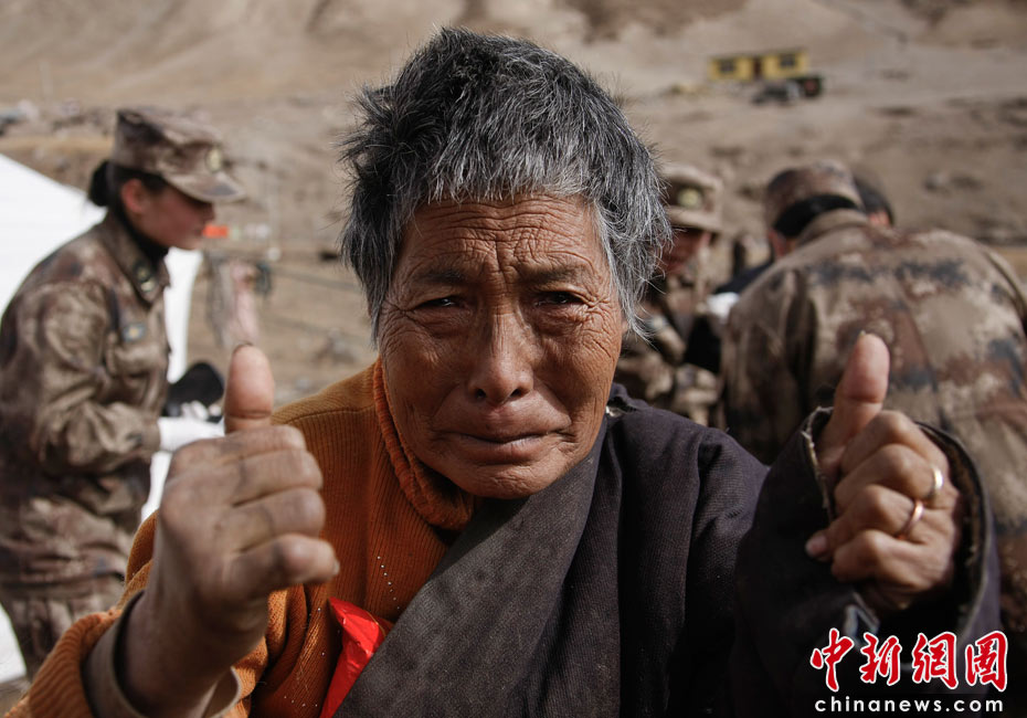 4月18日,總后青藏兵站部抗震醫(yī)療隊(duì)在青海玉樹震中結(jié)古鎮(zhèn)展開救援的同時,還派員向周邊牧區(qū)巡診,救治傷病員。圖為黃林格頭牧區(qū)78歲的旦樣老阿媽熱淚盈眶地向醫(yī)務(wù)人員豎起大了拇指。中新社發(fā) 鄒小慶 攝