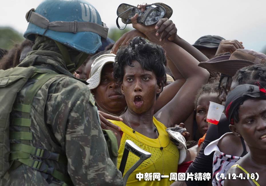 4月12日周一,海底太子港一個無家可歸的地震幸存者與前來分發(fā)食品的巴西聯(lián)合國維和人員發(fā)生口角。