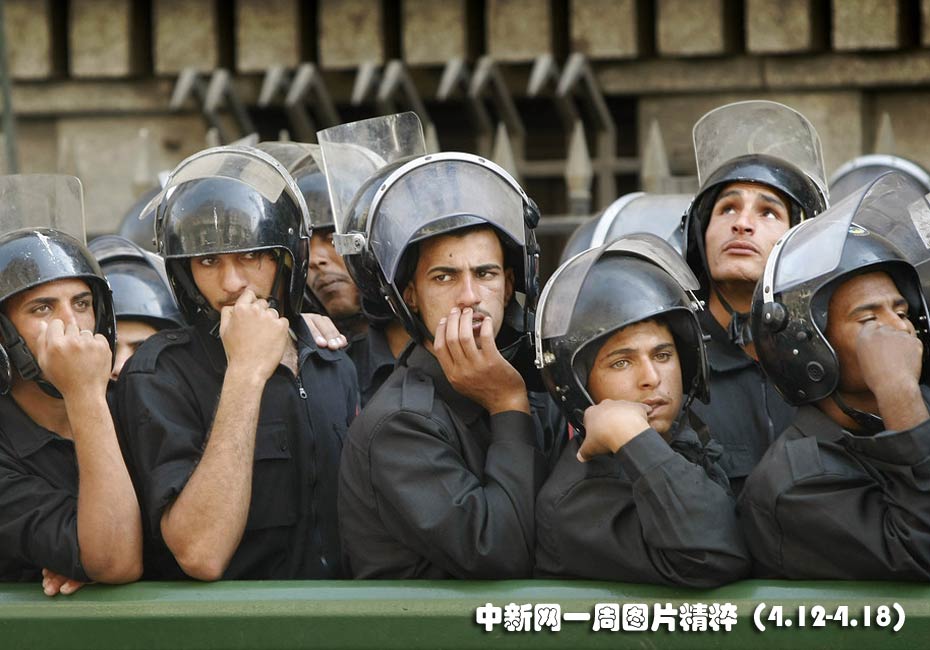 4月13日周二,埃及開(kāi)羅市中心一支安全部隊(duì)封鎖示威者。