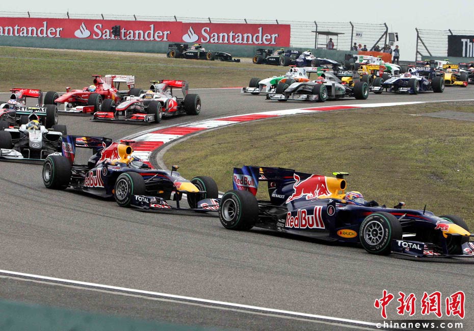 4月18日下午,2010國際汽聯(lián)F1世界錦標(biāo)賽上海站在上海國際賽車場舉行正式比賽,邁凱輪車隊(duì)的英國車手巴頓在雨中獲得冠軍、隊(duì)友、英國車手漢密爾頓獲得亞軍,梅賽德斯GP車隊(duì)的德國車手羅斯伯格獲得季軍。圖為比賽發(fā)車后眾位車手通過一號彎。中新社記者 任晨鳴 攝