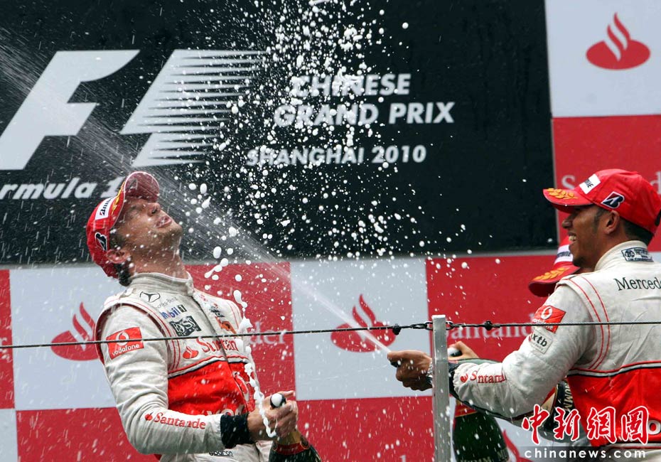 圖為伯頓與隊友漢密爾頓開香檳祝賀。中新社記者 任晨鳴 攝